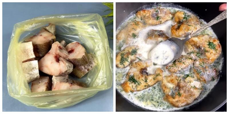 1. Минтай добре промиваємо, видаляємо все зайве, нарізаємо на порційні шматочки та перекладаємо у звичайний поліетиленовий пакет.