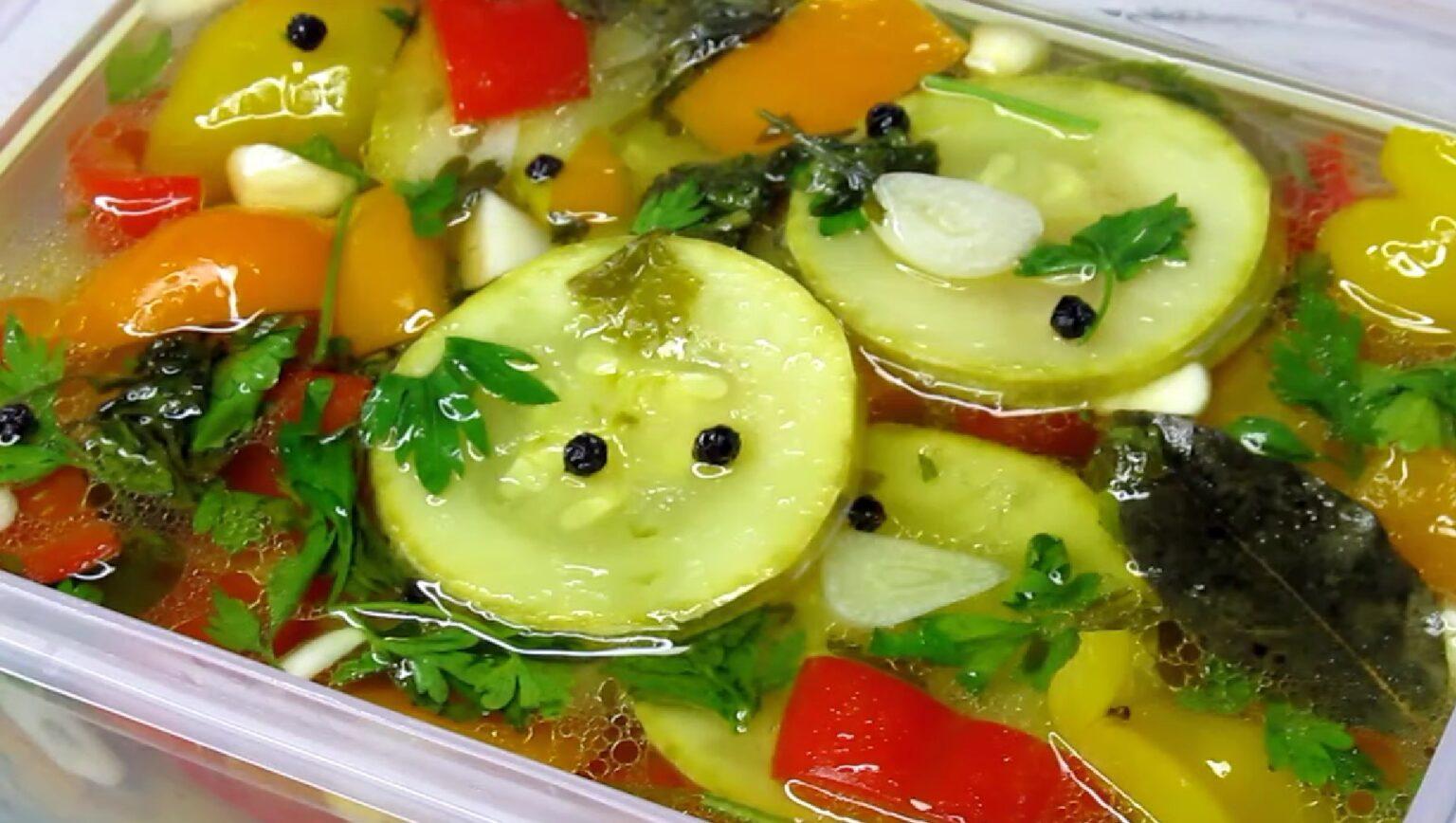 Наріжте кабачки кружечками завтовшки 0,8-1 см. Болгарський перець наріжте невеликим кубиком. Для приготування маринаду додайте до киплячої води всі інгредієнти. Прокип’ятіть маринад пару хвилин і покладіть у нього підготовлені кабачки, частину подрібненої петрушки та часнику. Проваріть кабачки 2-3 хвилини та дістаньте їх із маринаду. Додайте в маринад перець і проваріть його 1,5-2 хвилини.